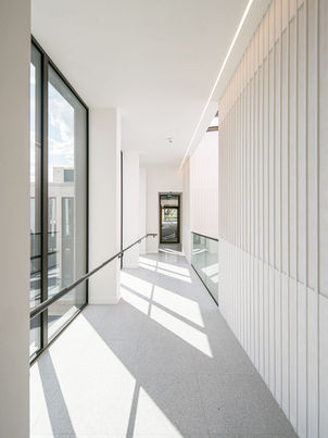 An der nördlichen Friedrichstraße, gegenüber dem Tacheles-Areal, entstand ein Büro- und Geschäftshaus als Ensemble aus saniertem Altbau und einem Neubau, die sich harmonisch zu einem neuen Ganzen ergänzen. Die Planung erfolgte in enger Abstimmung mit Stadtplanung und Denkmalschutz, so dass das Gebäude die ortstypische Hoftypologie aufnimmt und in seiner Kubatur sich in das Stadtbild der Friedrich-Wilhelm Stadt einordnet. Der Bestand wurde behutsam saniert, die altbautypischen Räume und Details im Vorderhaus blieben erhalten und wurden fortgeschrieben. Das neue Hinterhaus ist als großflächige Bürofläche flexibel nutzbar konzipiert mit einem großartigen Blick ins Grüne des Humboldtcampus. Der nördliche Verbindungsbau mit Stuckmarmor verkleideten Aufzugskernen verbindet beide Teile über Rampen entlang eines Atriums. Hierüber ist das ganze Haus barrierefrei erschlossen. Als verbindendes Element zieht sich eine Natursteinverkleidung vom Erdgeschoß des Altbaus durch die Durchfahrt in den Hof auf die gesamte Fassade des Neubaus.